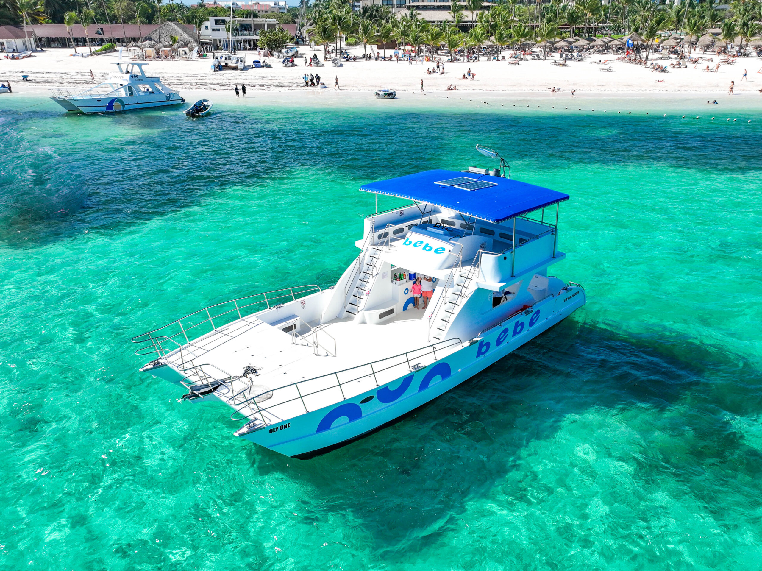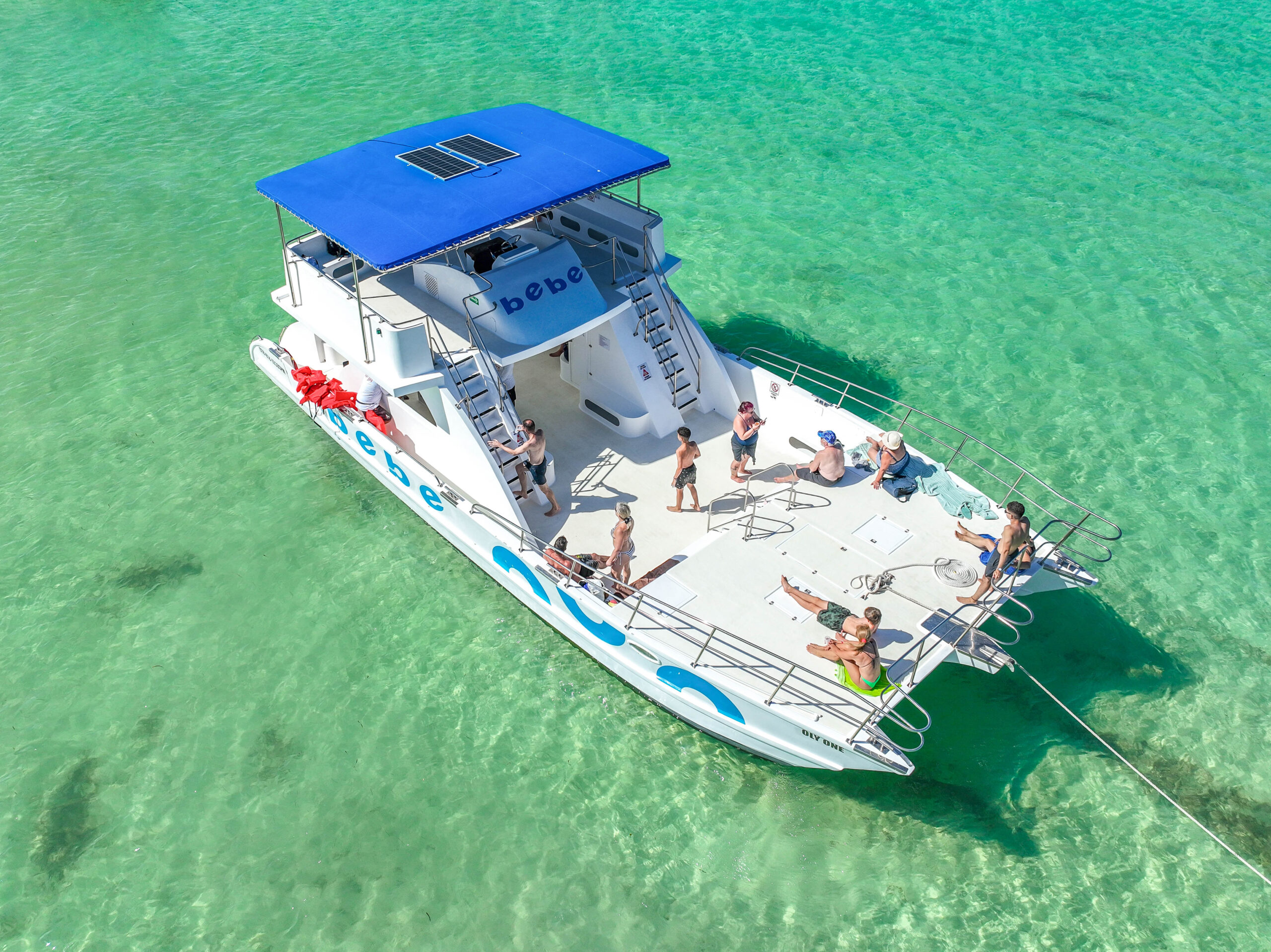 OLY ONE: An exclusive private catamaran, with capacity for up to 60 people and a minimum of 30 passengers, designed to provide an unforgettable experience. This catamaran features a spacious deck, ideal for relaxing, sunbathing, and enjoying the sea breeze.